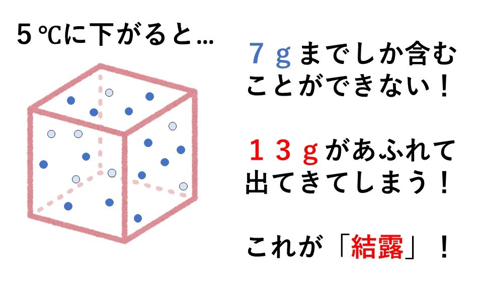 結露は、「温度によって飽和水蒸気量に差がある」ことが原因だったのです!