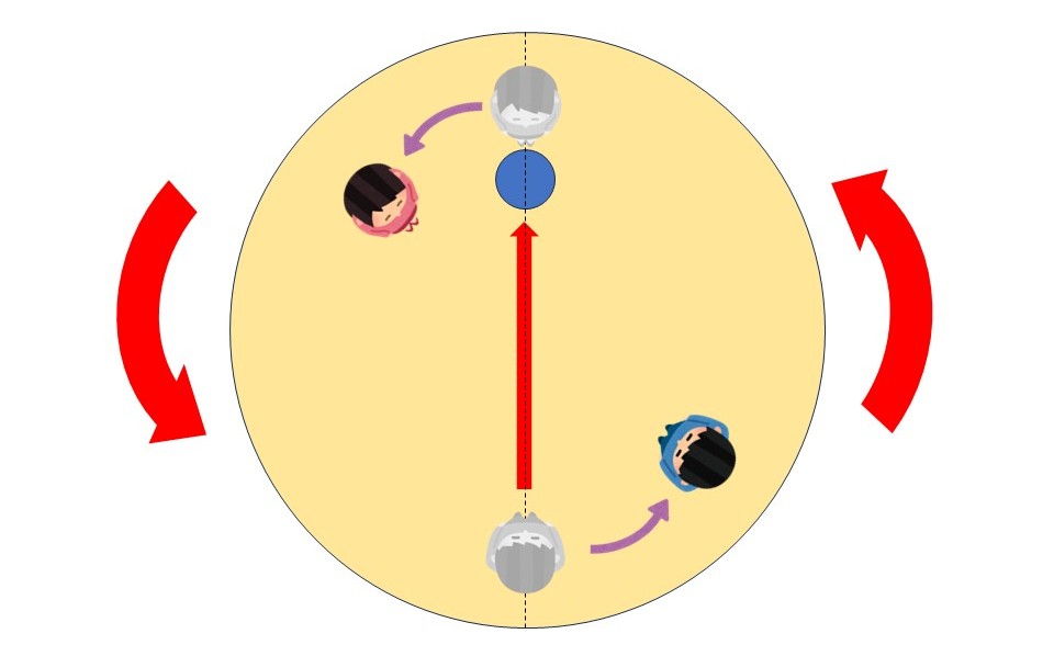 この時、ボールはまっすぐ飛んでいるにもかかわらず、投げた人から見ると右に曲がったように見えます。