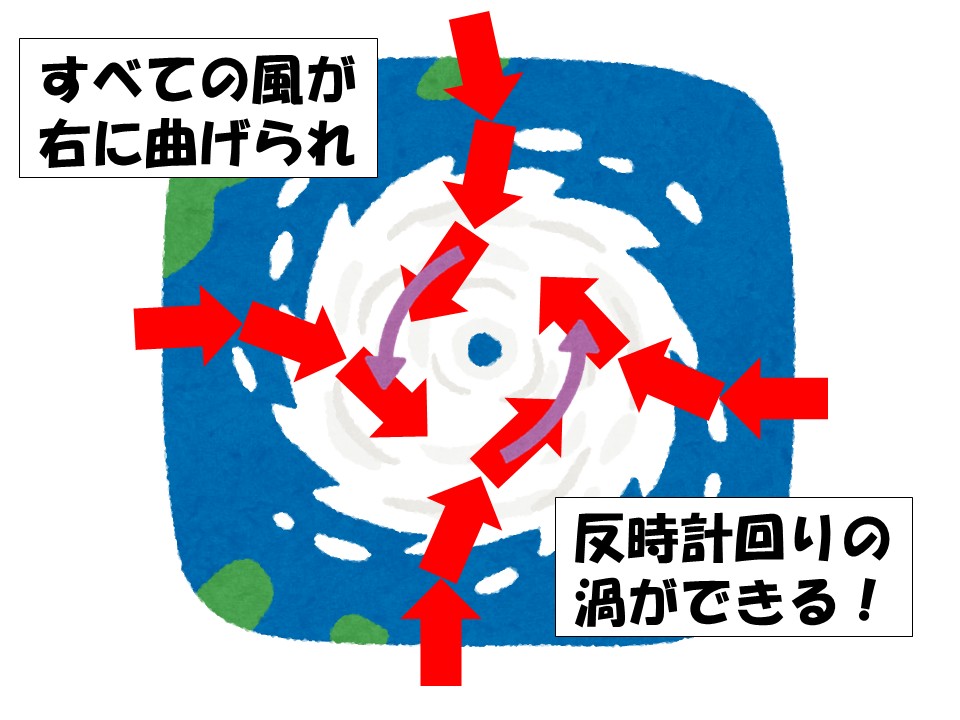 なぜこのようなことになるかというと、「コリオリの力」というものがあるから、です。