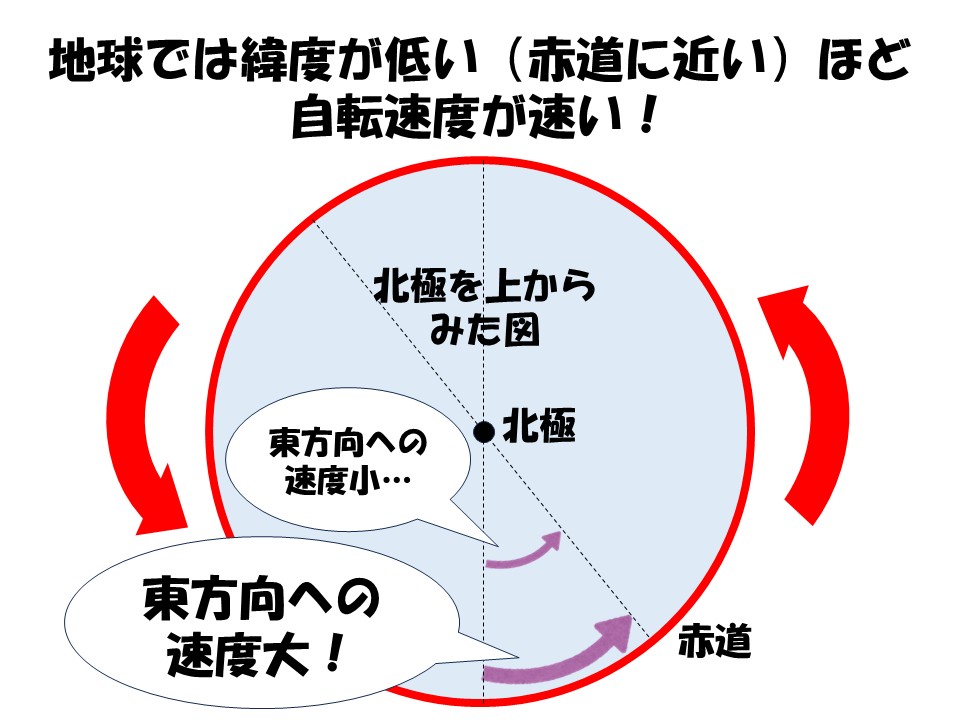 コリオリの力を理解するのに大切な要因、緯度の違いによる地球の自転速度の違いがあります。