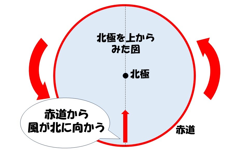 赤道付近から北にむかって風が吹くとしましょう。↓