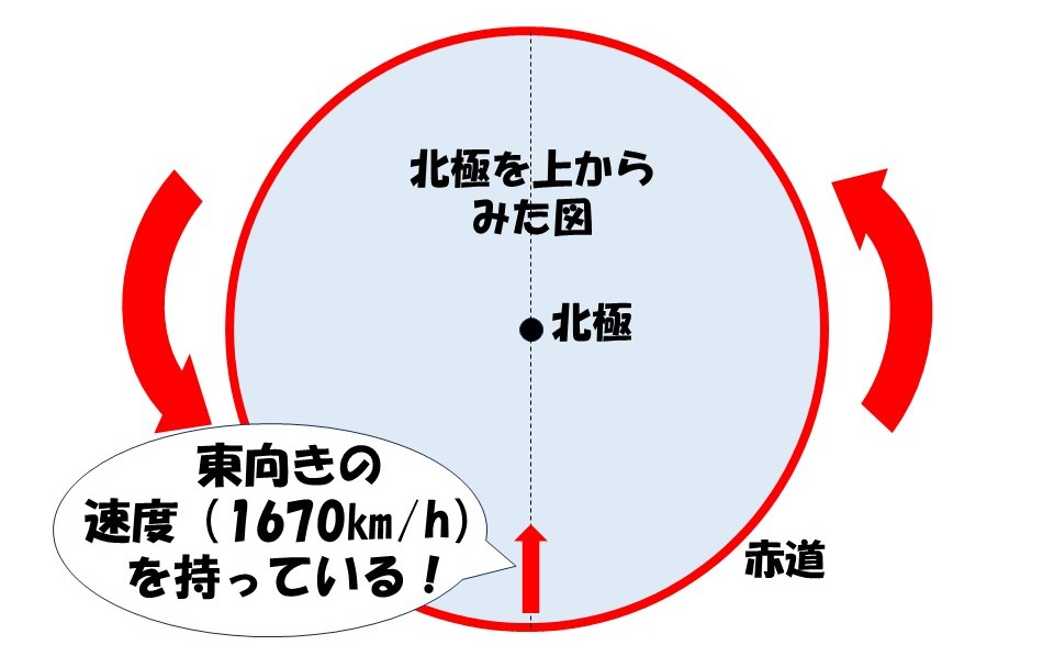 地球上にあるものはすべて、地球の自転によって超高速で東に動いています。