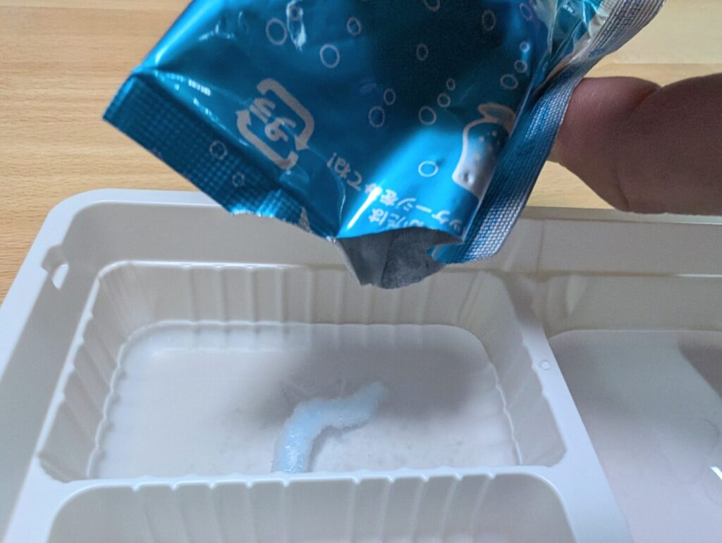 トレーの一番大きいスペースに、水と粉を入れていきます。