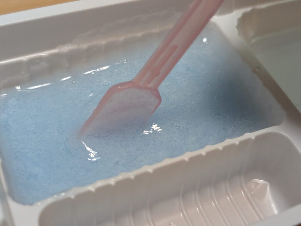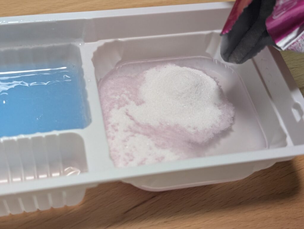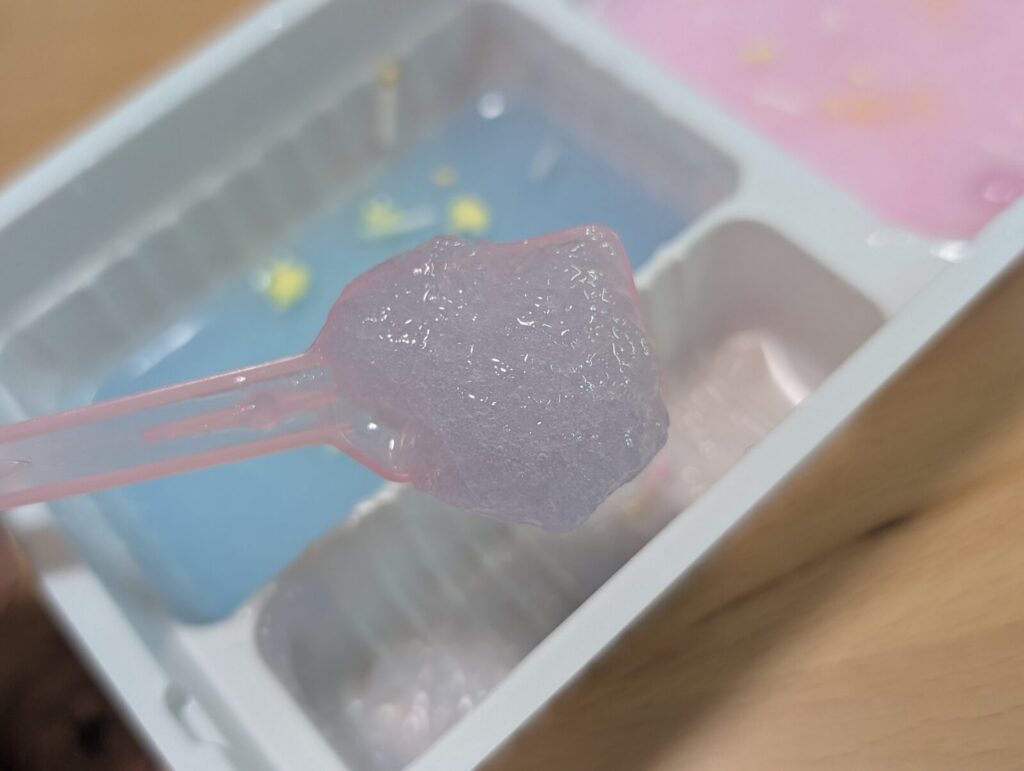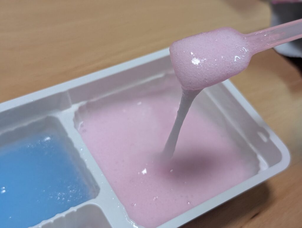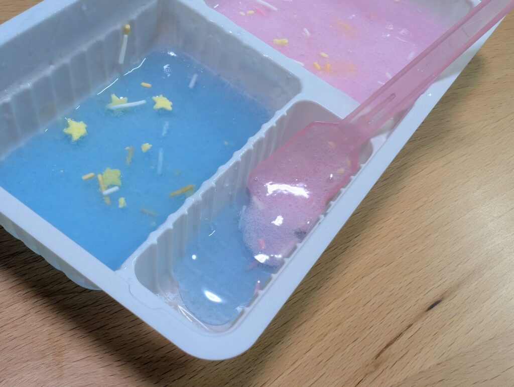 最後に空いているトレーで2つのスライムゼリーを混ぜてみましょう。