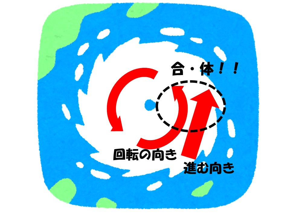 このとき、台風の東側では「台風の進む方向」と「台風の風」が合体して、より強い風がふくのです。