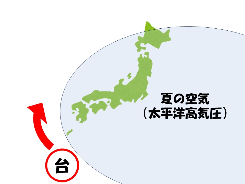 夏:海水温が上がり、いよいよ台風が成長しやすくなってきます。しかし、夏の台風は日本に近づくことは少ないです。その原因はずばり、「太平洋高気圧の存在」です!
