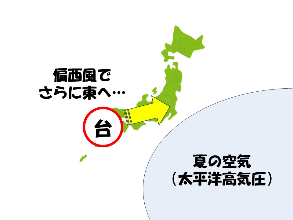 このため、台風はうまい具合に、九州→中国・四国→近畿→中部→関東・東北と全国的に横断してしまうわけです。