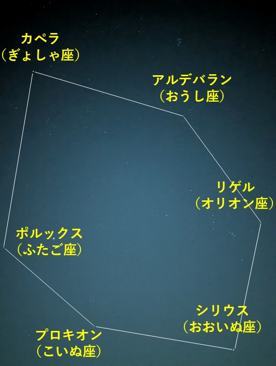 オリオン座のリゲル、おうし座のアルデバラン、ぎょしゃ座のカペラ、ふたご座のポルックス、こいぬ座のプロキオン、そしておおいぬ座のシリウス。