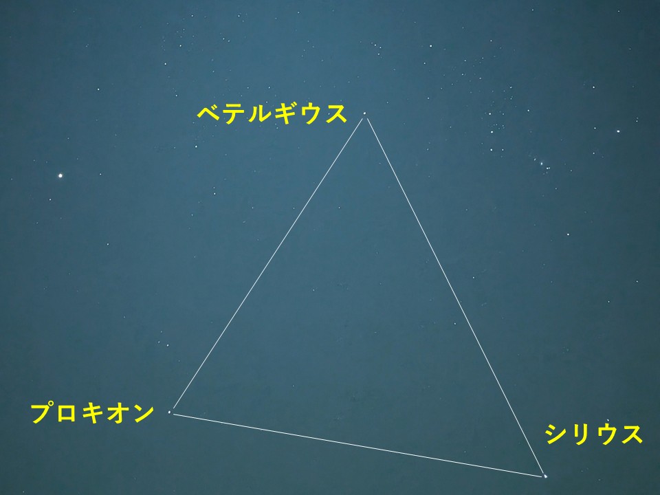 オリオン座のベテルギウス、おおいぬ座のシリウス、こいぬ座のプロキオンからなる、正三角形に近い大三角です。