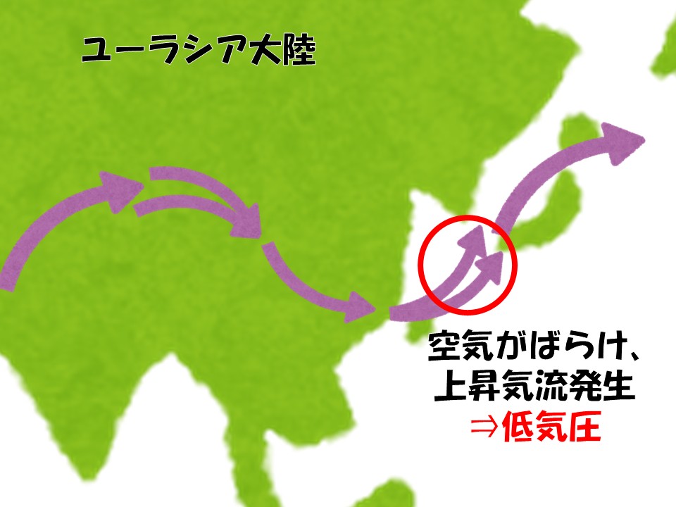 風がばらけると空気が足りなくなり、足りなくなったように空気が吸われて上昇気流が発生し、低気圧となるのです。