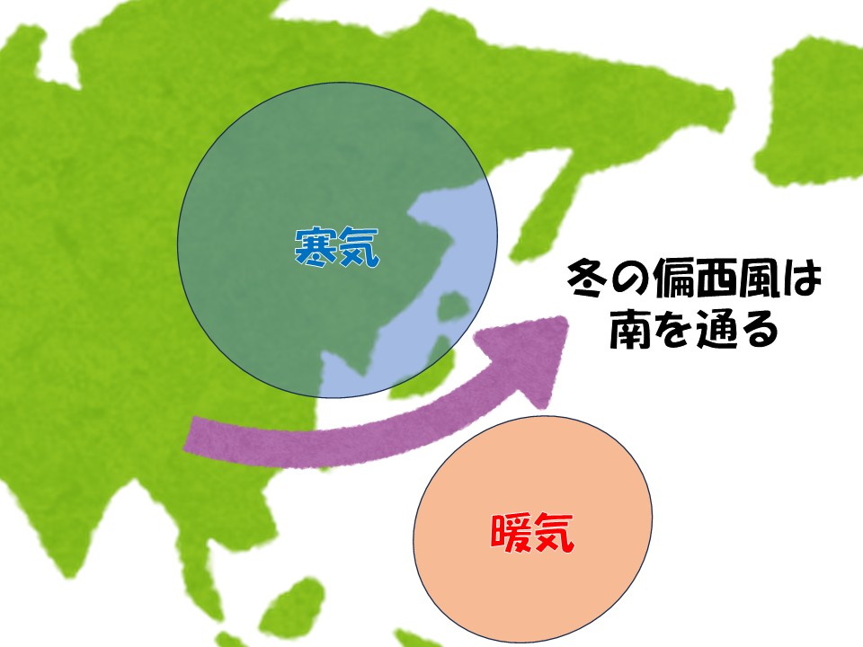 冬の時期は、冷たい空気が日本上空に、温かい空気が南の太平洋側にあるため、日本の南を通っています。↓