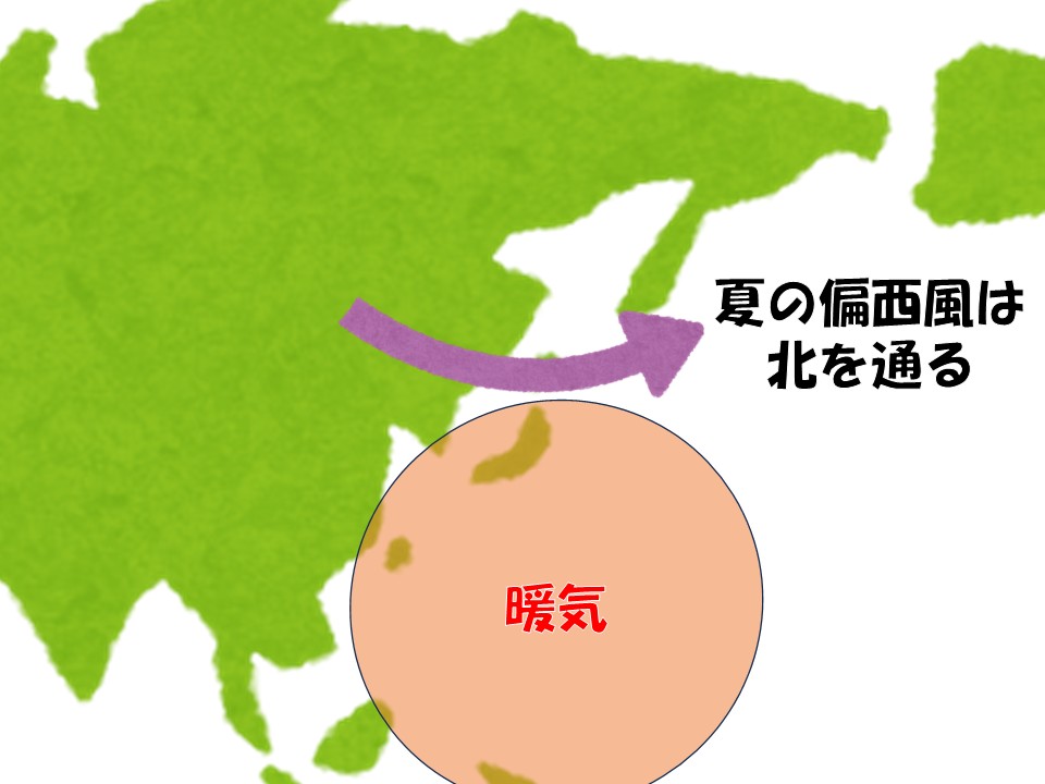 一方で夏の時期は、温かい空気がぐっと日本上空に張り出し、冷たい空気は日本の北側に追いやられるため、日本の北側に通り道ができます。↓
