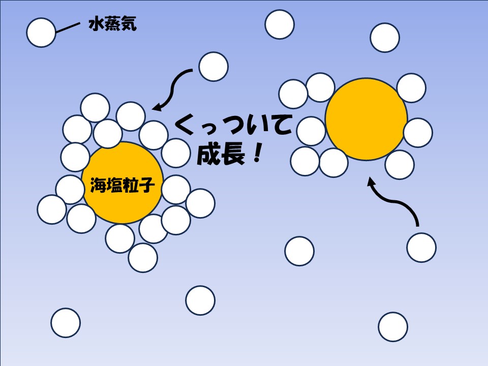 海塩粒子は、水蒸気が水や氷のつぶになるときの「核」になるのです。